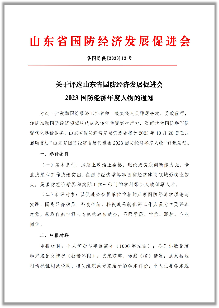 > 关于评选山东省国防经济发展促进会2023国防经济年度人物的通知